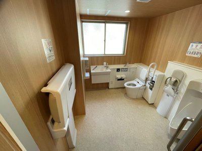 車椅子をご利用の方や小さなお子様連れのご家族、ご高齢のお客様など、幅広い方に安心してご利用いただけるよう、広々としたバリアフリー空間に手すり付き洋式トイレ・洗面台・小便器・おむつ交換台を備えました。